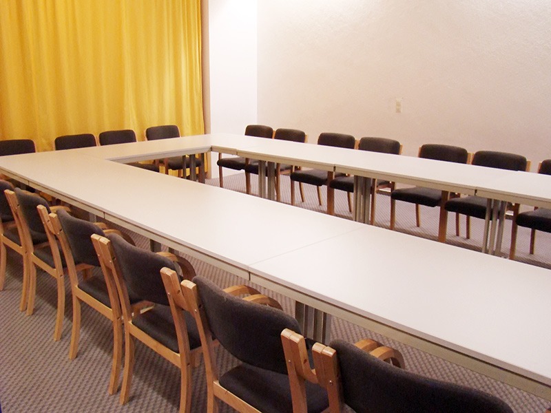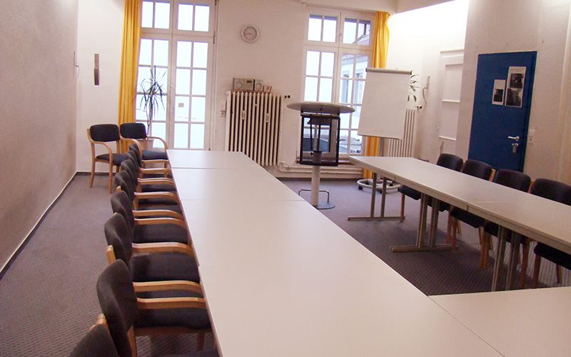 Er ist vollständig für solche Zwecke möbliert (Tische, Stühle, Flipchart, Foyer mit Teeküchenzeile und Toilette etc…).